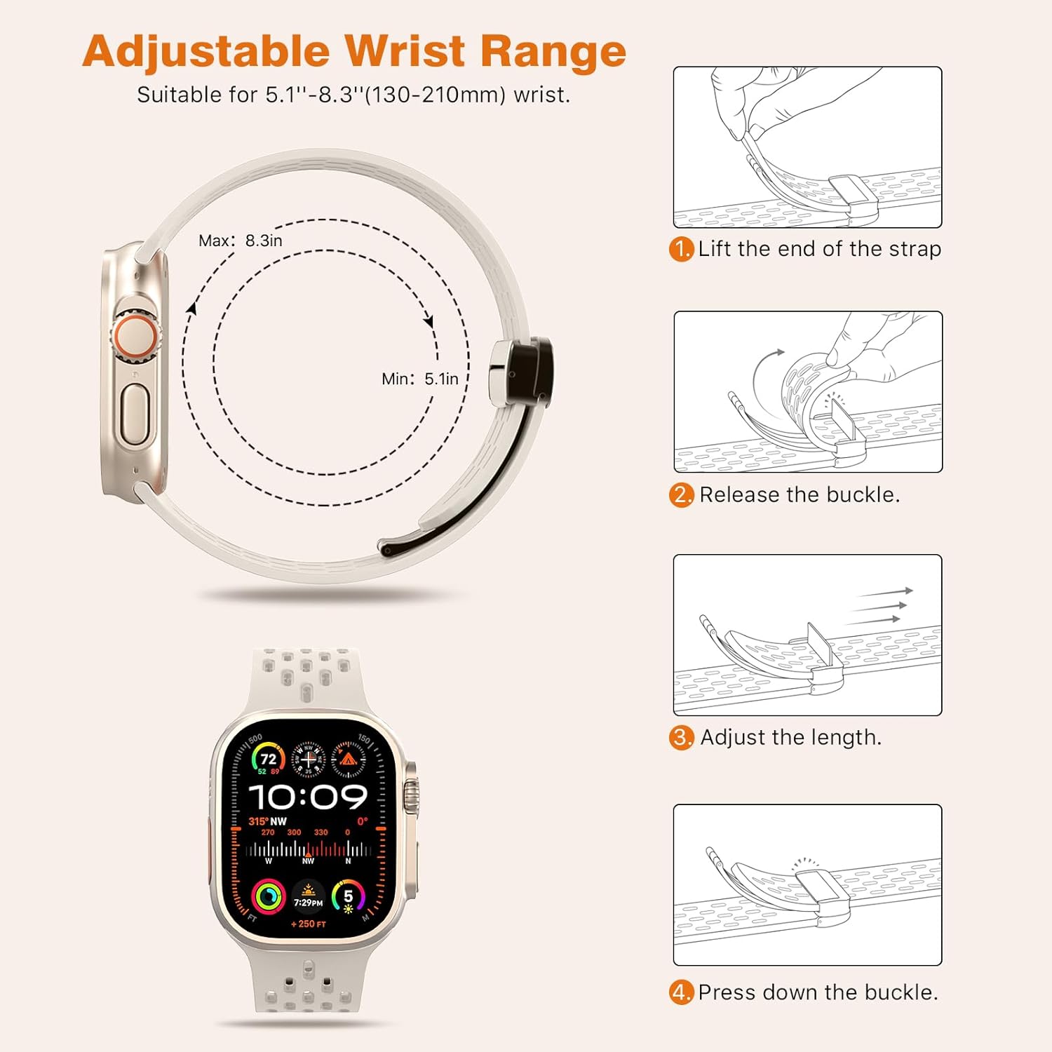 • [Available size] There is a fixed buckle on the inside of the strap, which can be opened by pulling it up hard. The strap can be freely adjusted to a suitable length, which is not affected by the hole spacing and can be pressed to lock. Our strap size is suitable for 5.5 to 8.5 inches (140 mm to 215 mm). Please measure your wrist before ordering.